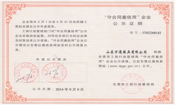 近日,经山东省东营市工商行政管理局审核批准,山东万通模具有限公司再度获得“守合同重信用企业”荣誉称号。公司已连续三年获此殊荣,凭借公司强大的实力和始终如一的卓越服务,再次得到行业与社会的认可。